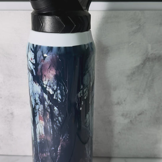 32oz sublimated tumbler. Has creepy scene with old house and blood